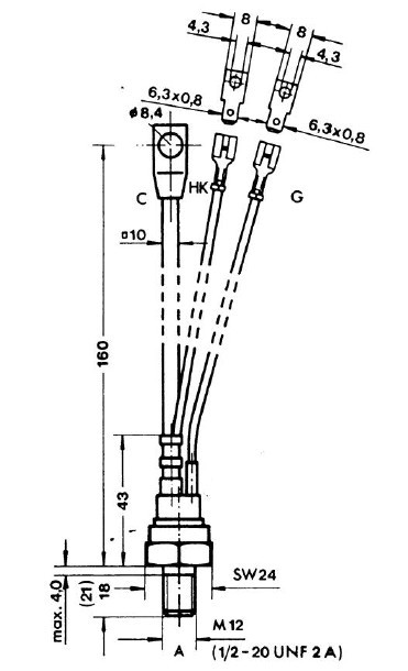 SKT552/16E features: (1)hermetic metal case with glass insulator; (2)threaded stud ISO M12; (3)international standard case.